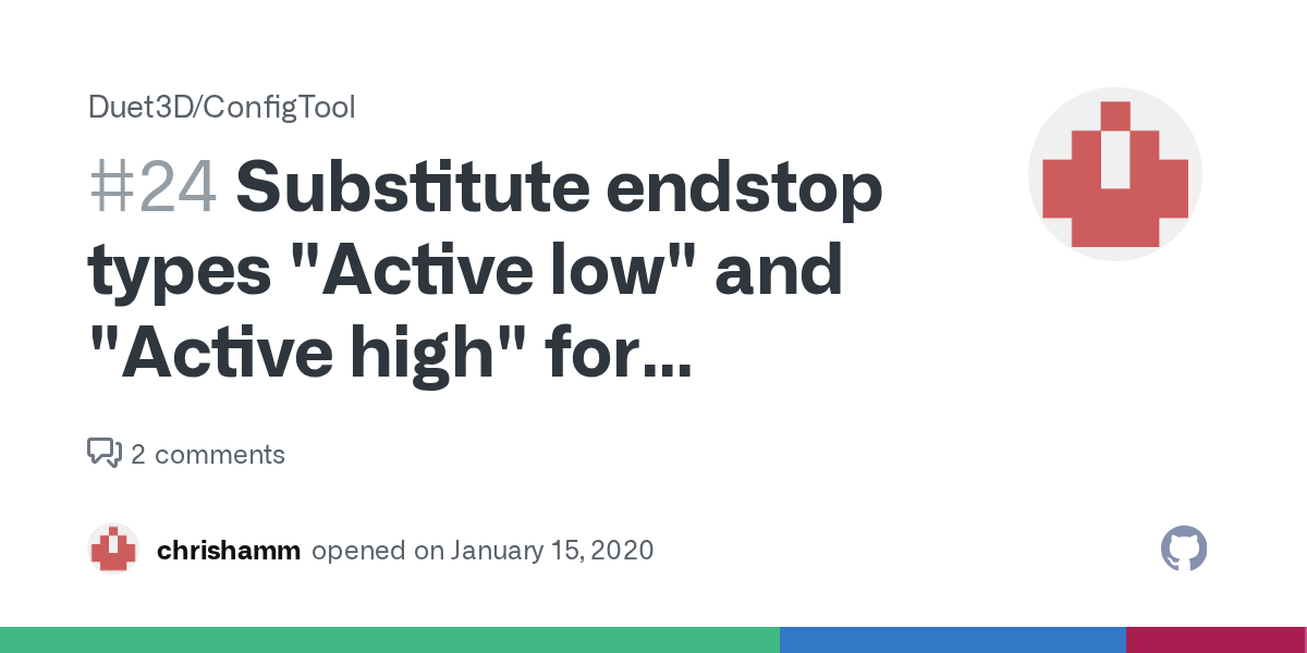 Step 1 connect the motors on z and e0... 14/06/2018 · you simply need to list the pins used for endstops in your m574 command. Step 1 connect the motors on z and e0. We design and produce the duet3d range of machine control electronics, along with the advanced reprapfirmware and. I have an issue with endstops sensing on duet 0.8.5. 31/05/2020 · it may be easier to use the web configurator to create a new config file set compatible with rrf3 and then compare it to your existing config to see how it's changed. We are a uk based company, formed in 2019, following on from a successful joint venture between think3dprint3d, one of the original developers of the duet, and escher3d, responsible primarily for firmware and addons.. 31/05/2020 · it may be easier to use the web configurator to create a new config file set compatible with rrf3 and then compare it to your existing config to see how it's changed.